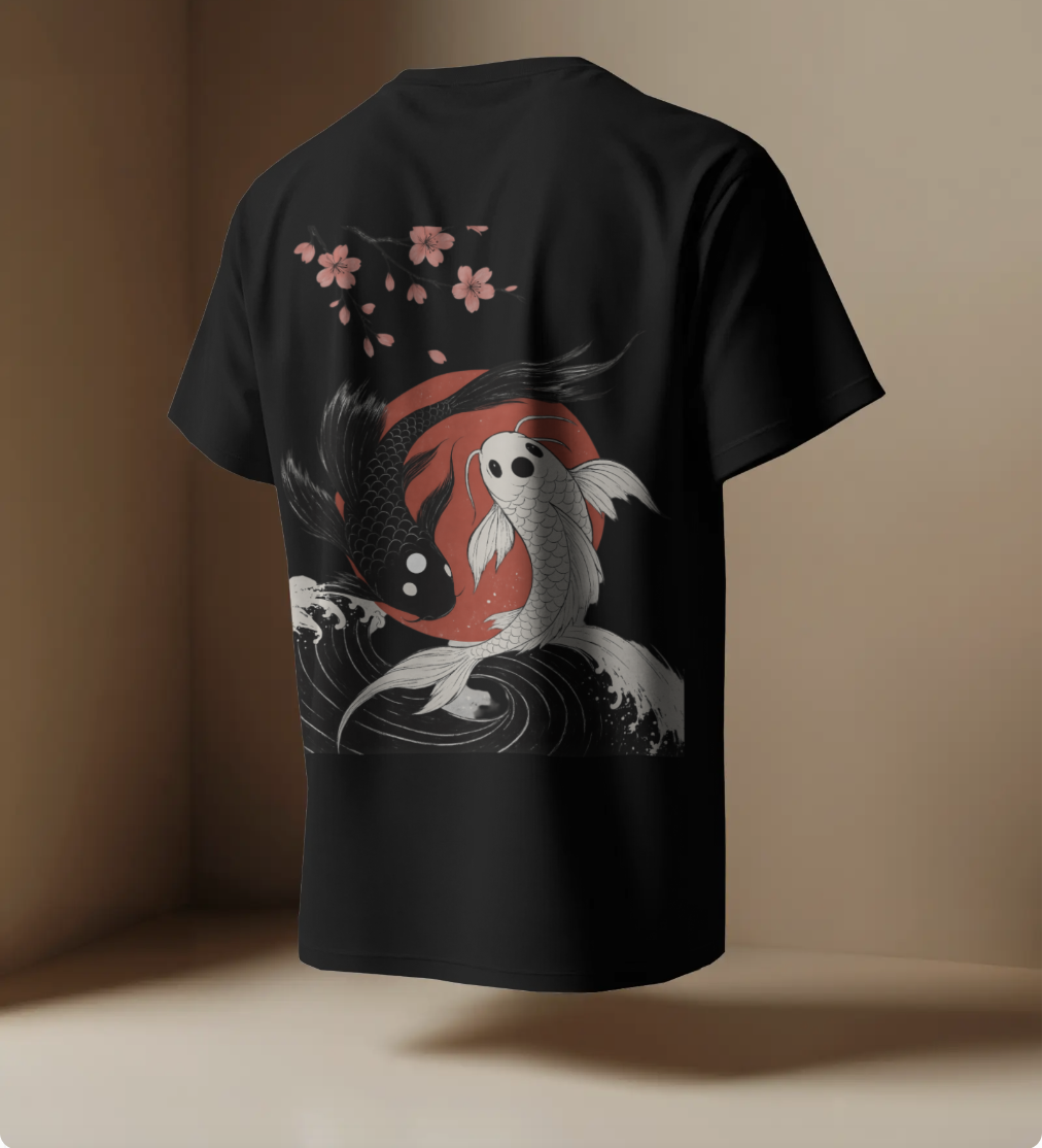 Dive into balance with our Yin Yang Koi Tee, where ancient symbolism meets bold streetwear. This design features two elegantly illustrated koi fish — one black, one white — swirling in perfect harmony against a vivid red sun. Cherry blossom branches float above, adding a soft contrast to the dynamic waves crashing below.